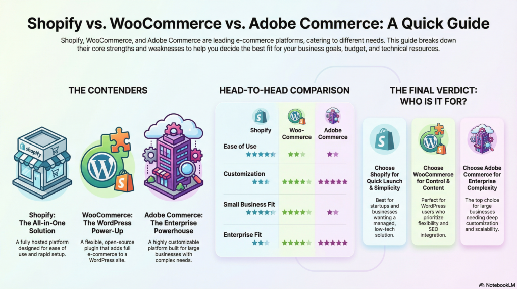 Shopify β great out of the box; WooCommerce β flexible but hosting dependent; Adobe Commerce β highest performance potential with correct optimization.